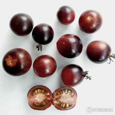 Главная отличительная черта сорта — экзотическая окраска зрелых плодов. Она формируется благодаря сочетанию двух пигментов: красного ликопина в мякоти и фиолетовых антоцианов в кожице. Последние активно синтезируются под воздействием прямых солнечных лучей.
