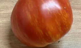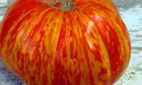 Сорт относится к категории «биколоров» (двуцветных) или полосатых томатов. Его главная «визитная карточка» — контрастная окраска: темно-красный, почти бордовый основной фон расчерчен неровными золотисто-желтыми полосами и разводами. Такой рисунок не является искусственным, это естественная генетическая особенность, которая стабильно проявляется при соблюдении агротехники.