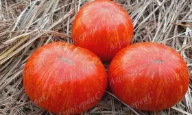 Плоды обладают высокой массой, характерной для салатных сортов, — от 200 до 300 граммов. Они многокамерные, с мясистой, плотной и сочной мякотью. При разрезе заметна ее сахаристая, «арбузная» структура. Семенных камер немного, семян содержится небольшое количество, что увеличивает долю полезной мякоти.