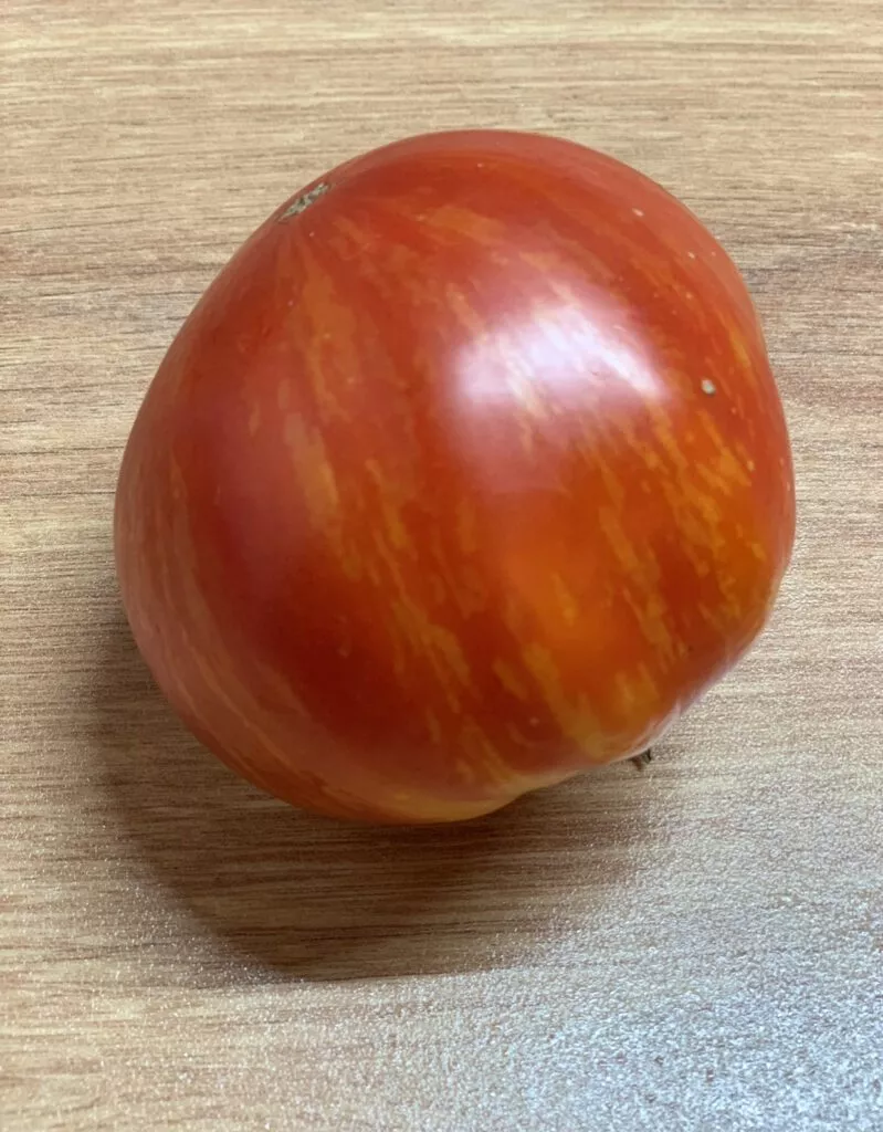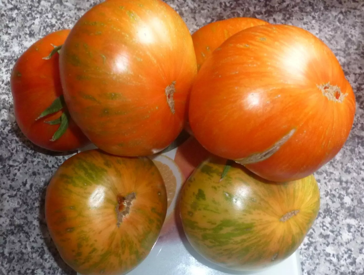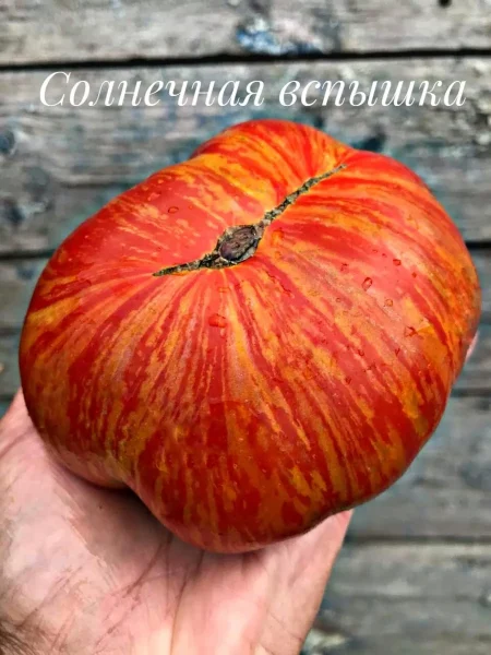 Главная отличительная черта сорта — декоративная и изменчивая окраска зрелых томатов. Основной цвет — темно-красный, но на его фоне проявляются яркие золотисто-желтые полосы, часто расходящиеся от плодоножки. Интенсивность этой «солнечной» штриховки напрямую зависит от условий освещения.