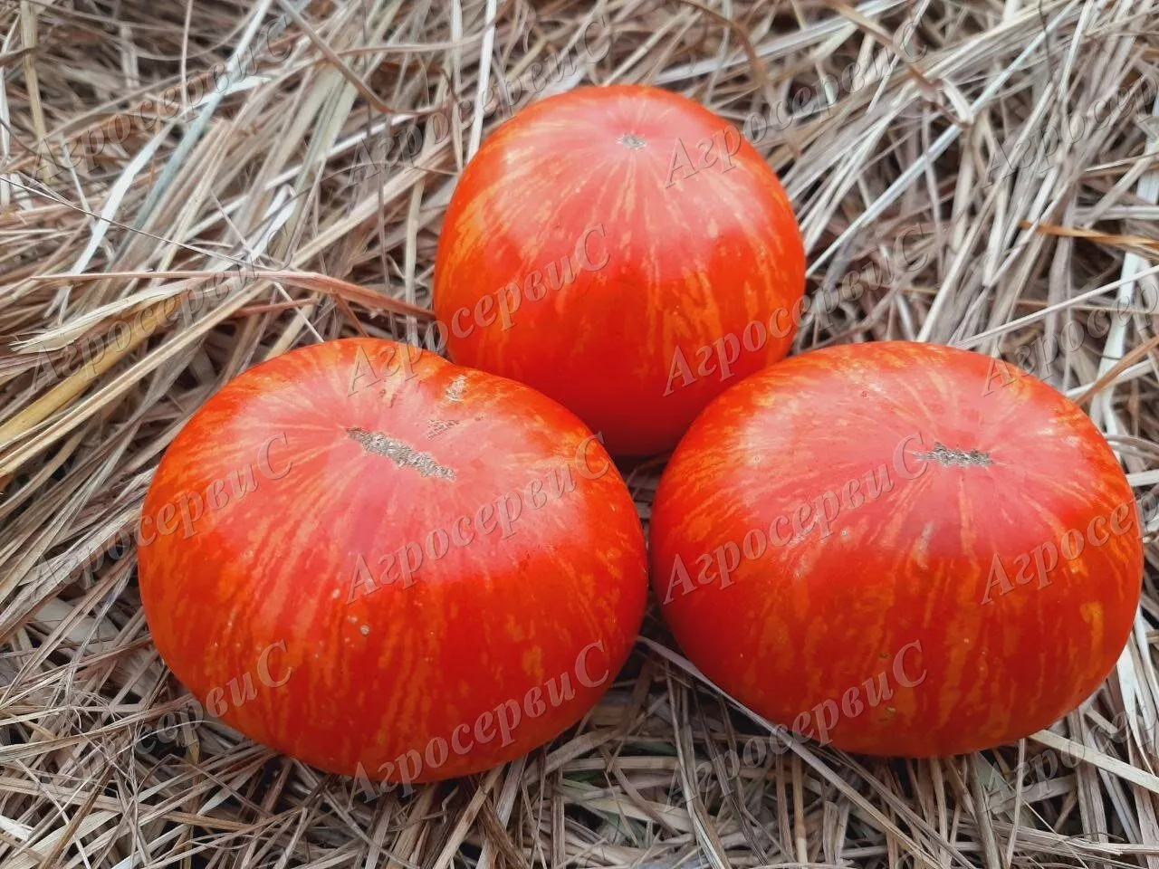 Сорт относится к категории «биколоров» (двуцветных) или полосатых томатов. Его главная «визитная карточка» — контрастная окраска: темно-красный, почти бордовый основной фон расчерчен неровными золотисто-желтыми полосами и разводами. Такой рисунок не является искусственным, это естественная генетическая особенность, которая стабильно проявляется при соблюдении агротехники.
