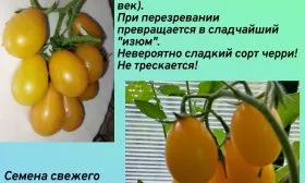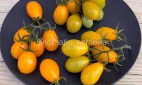 Плоды собраны в сложные, разветвленные кисти. На одной такой кисти может одновременно формироваться и созревать несколько десятков помидорок. В период массового плодоношения куст, усыпанный гроздьями солнечно-желтых плодов, представляет собой высокодекоративное зрелище.