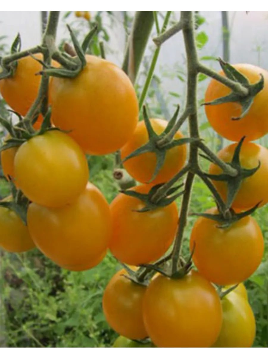 Плоды собраны в сложные, разветвленные кисти. На одной такой кисти может одновременно формироваться и созревать несколько десятков помидорок. В период массового плодоношения куст, усыпанный гроздьями солнечно-желтых плодов, представляет собой высокодекоративное зрелище.