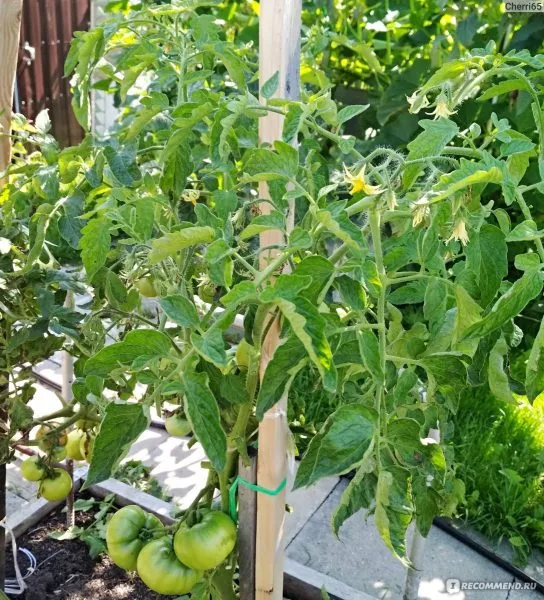 Высокорослый куст, достигающий двух метров, требует надежной вертикальной подвязки к шпалере или кольям. Подвязывать нужно не только главный стбель, но и тяжелые плодовые кисти по мере налива плодов, чтобы избежать обламывания.