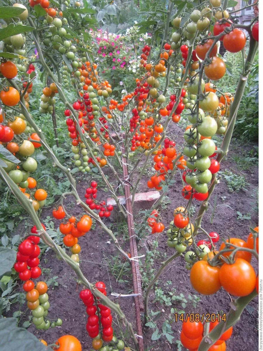 Главная отличительная черта сорта — характер плодоношения. Плоды завязываются и созревают в длинных, разветвленных кистях (гроздьях), напоминающих виноградные. На одной такой кисти может одновременно наливаться и созревать до 30-40, а иногда и более, одинаковых по размеру помидорок. Это создает высокую нагрузку на побег, поэтому подвязывать нужно не только основной стебель, но и тяжелые плодовые кисти.