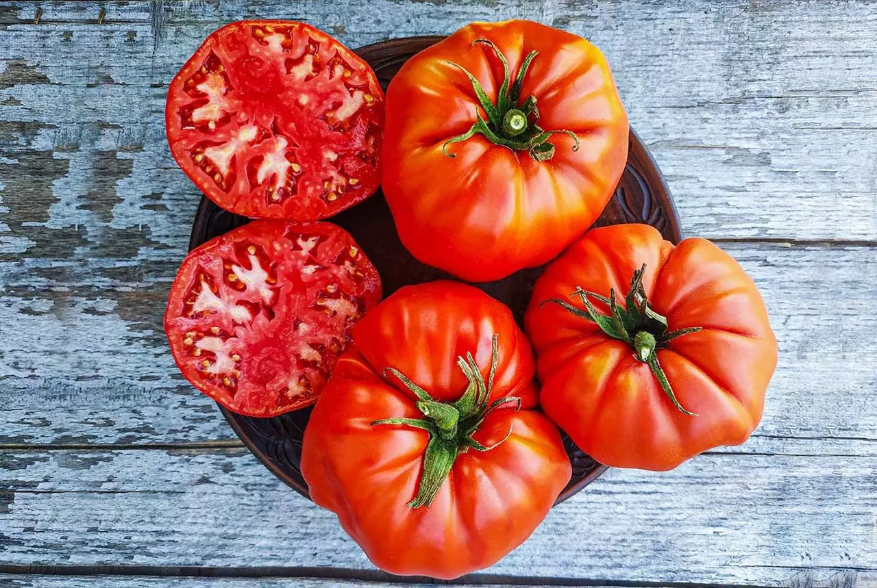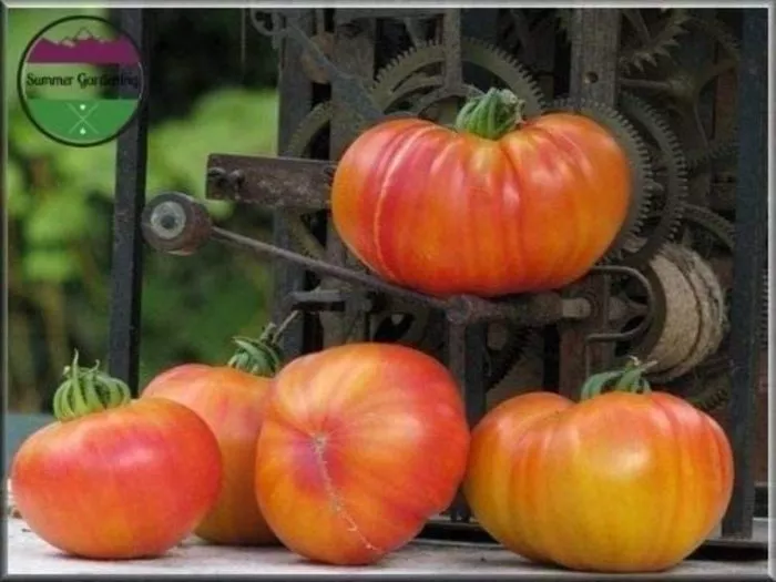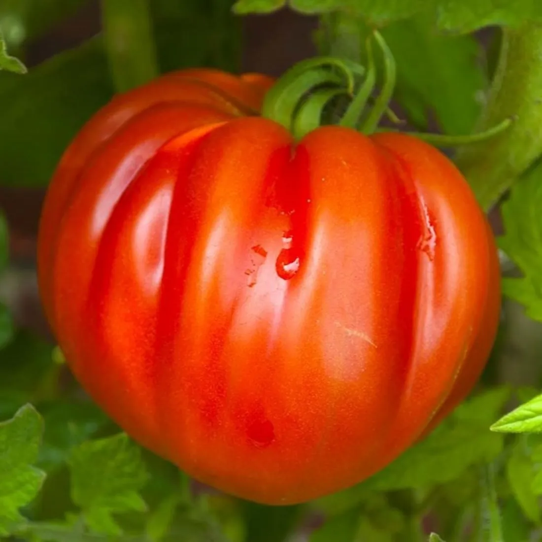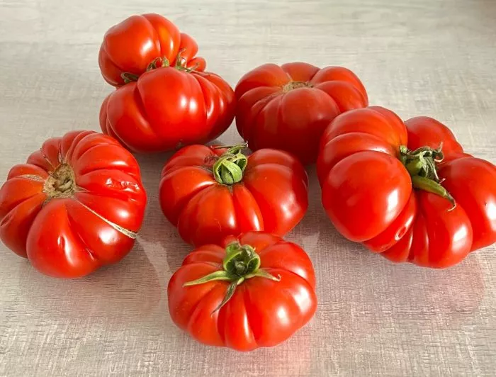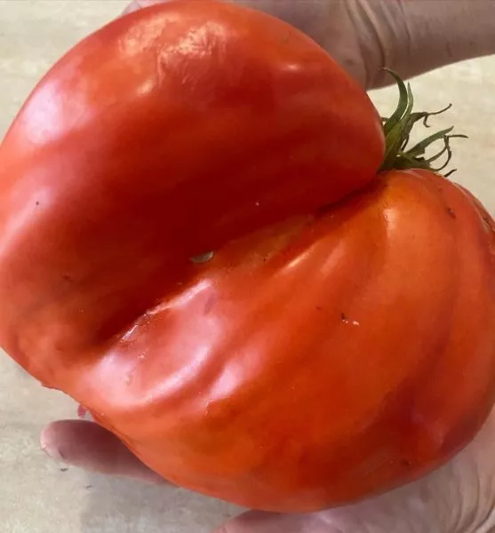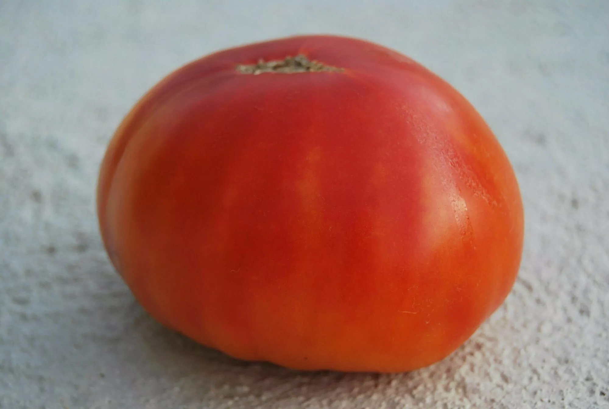 Плоды имеют характерную плоско-округлую форму, часто с выраженной ребристостью в области плодоножки. Эта особенность типична для многих исторических сортов биф-томатов (крупноплодных мясистых томатов). При полном созревании окраска становится равномерной, ярко-алой, без зеленых пятен у основания.