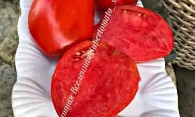 На разрезе видна характерная особенность: мякоть очень плотная, мясистая и с высоким содержанием сухих веществ, что и описывается как «сахаристая». Семенных камер немного, они небольшие по размеру, а семенная жидкость (желе) занимает минимальный объем. Такое строение, известное как пониженная сочность, напрямую связано с назначением плодов — они идеально подходят для переработки на густые соусы, пасту и вяление, так как дают большой выход мякоти при минимальном количестве отходов.