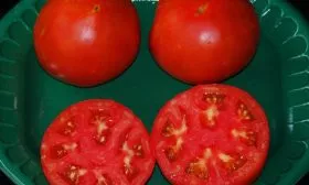 Созревание проходит равномерно, без формирования жесткого зеленого пятна у плодоножки, что является несомненным плюсом для товарного вида. Насыщенный ярко-красный цвет кожицы равномерно распределяется по всей поверхности. Мякоть в разрезе демонстрирует классическую салатную структуру: она очень мясистая, сочная, с немногочисленными семенными камерами.