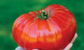 | Цвет и форма плода | Красный, округлая | Классический вид биф-томата (крупноплодного мясистого типа): плоды слегка приплюснутые, с выраженной ребристостью у плодоножки. |