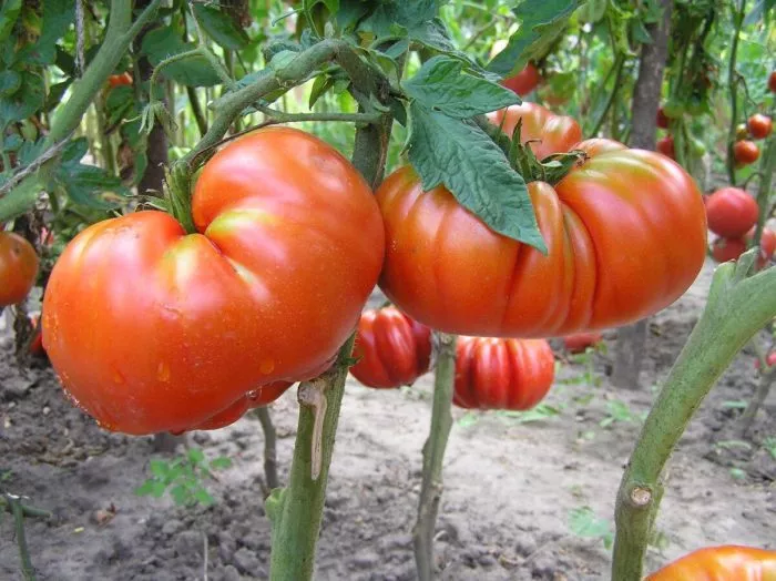 | Цвет и форма плода | Красный, округлая | Классический вид биф-томата (крупноплодного мясистого типа): плоды слегка приплюснутые, с выраженной ребристостью у плодоножки. |