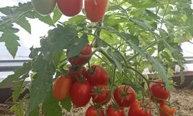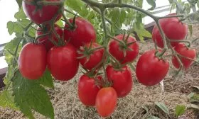 Плоды формируются в простых, компактных кистях. На каждой кисти одновременно завязывается и созревает от 5 до 7 плодов. Такое расположение, в сочетании с ограниченной высотой куста, создает эффект обильного плодоношения, когда растение выглядит буквально усыпанным гроздьями ярких, однородных томатов.