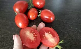 Плоды – главное достоинство сорта. Они отличаются высокой выравненностью, то есть в одной кисти и на разных кустах помидоры имеют практически одинаковый размер и вес, соответствующий заявленному диапазону 55-70 граммов. Форма округлая, с легкой приплюснутостью у вершины и основания.