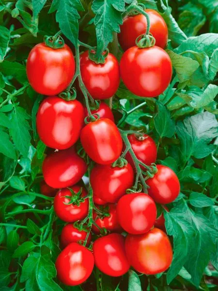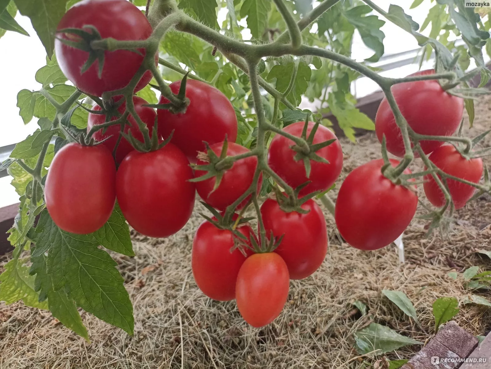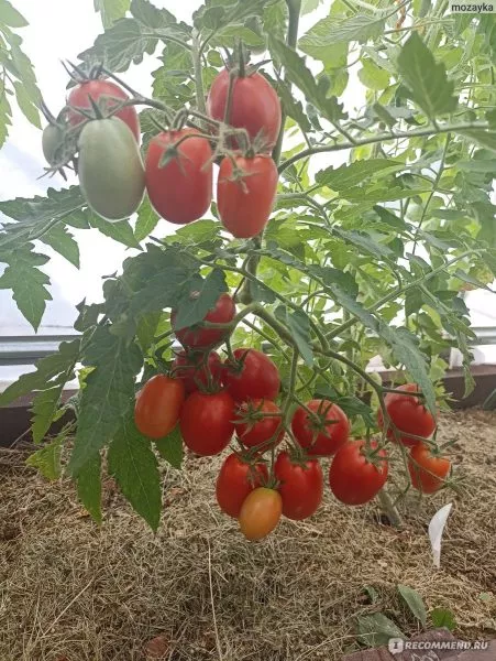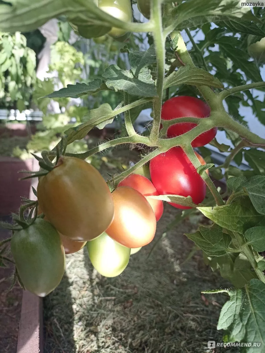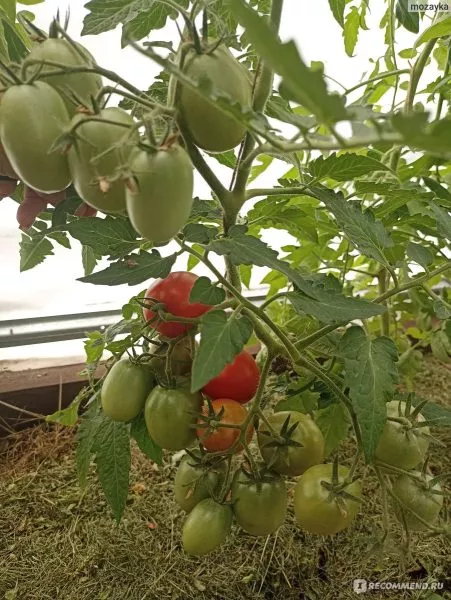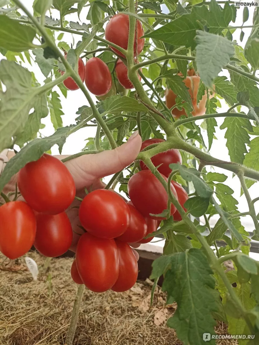 Плоды формируются в простых, компактных кистях. На каждой кисти одновременно завязывается и созревает от 5 до 7 плодов. Такое расположение, в сочетании с ограниченной высотой куста, создает эффект обильного плодоношения, когда растение выглядит буквально усыпанным гроздьями ярких, однородных томатов.