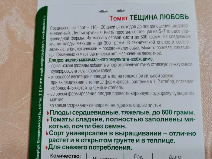 Статус сорта, а не гибрида F1, является его фундаментальной особенностью. Это означает, что растение способно стабильно передавать свои признаки потомству через семена. Огородник, однажды приобретший семена, может самостоятельно заготавливать их из самых лучших плодов для посева в последующие годы, не теряя характерных качеств «Тещиной любви».