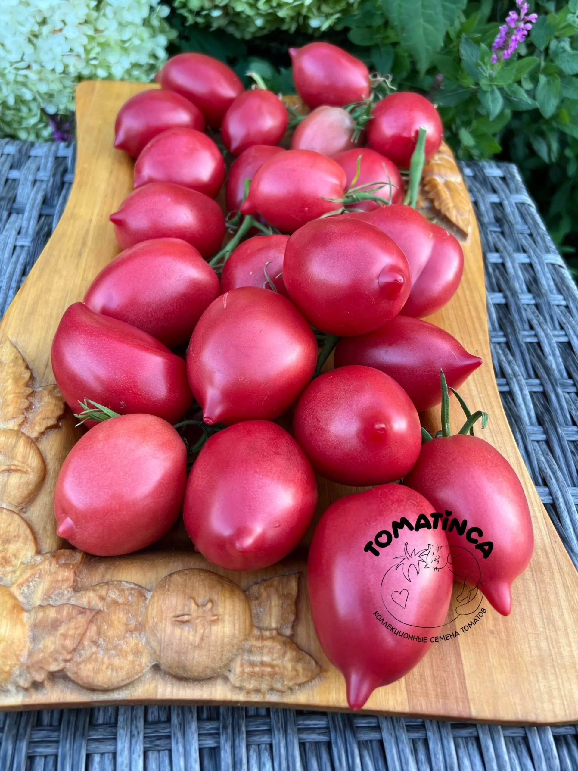 Именно плоды – визитная карточка этого сорта. Их форма соответствует заявленной сердцевидной, часто с хорошо выраженным острым «носиком» у вершины, что придает томатам особенно нарядный вид. В стадии полной, биологической зрелости кожица и мякоть приобретают равномерный, насыщенный розово-малиновый оттенок без зеленого пятна у плодоножки.
