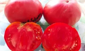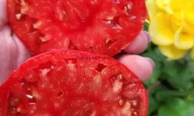 Мякоть исключительно плотная, мясистая и многокамерная. При разрезе она имеет сахаристый, зернистый излом, характерный для биф-томатов. Семенных камер мало, а сами семян содержится небольшое количество, что является прямым следствием высокой мясистости.