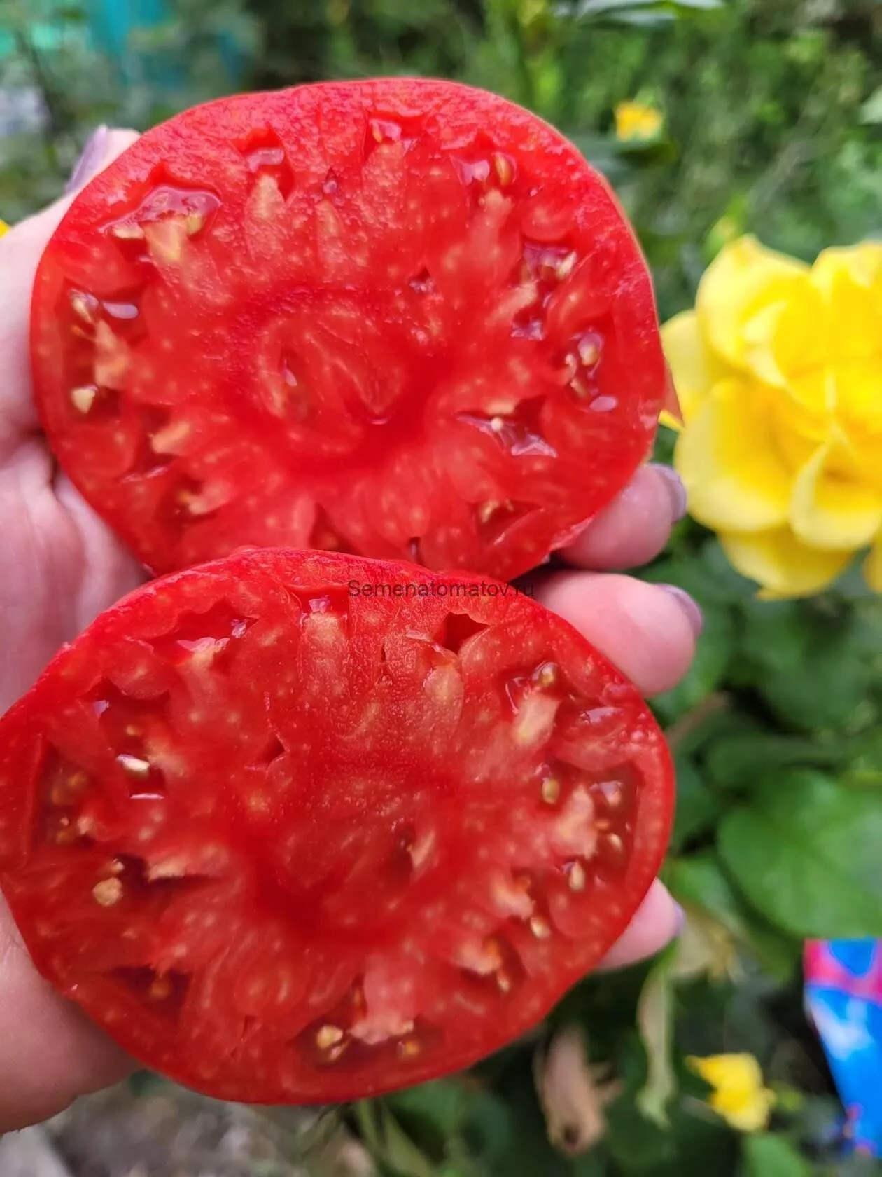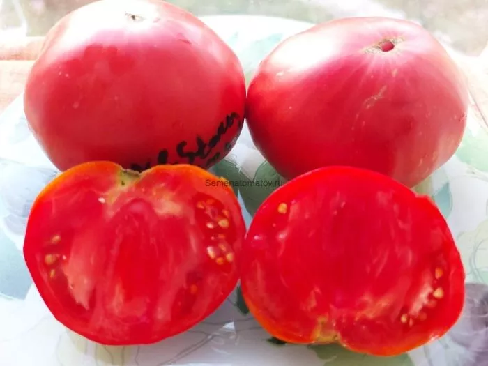 Мякоть исключительно плотная, мясистая и многокамерная. При разрезе она имеет сахаристый, зернистый излом, характерный для биф-томатов. Семенных камер мало, а сами семян содержится небольшое количество, что является прямым следствием высокой мясистости.