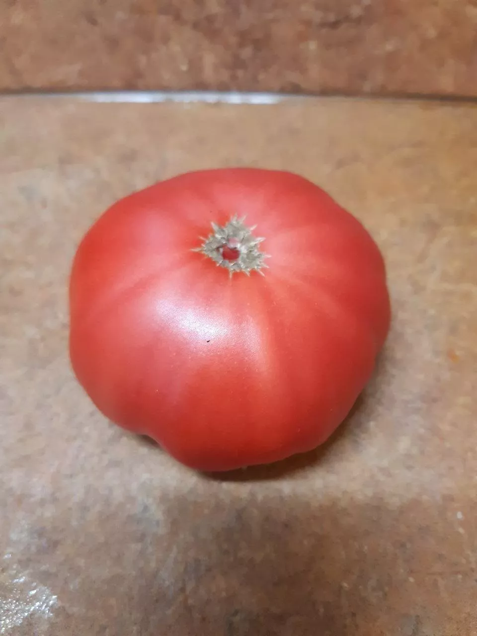 Плоды — визитная карточка сорта. Их форма плоскоокруглая, с ярко выраженной ребристостью, особенно заметной в области плодоножки. Эта ребристость — ключевой отличительный признак, придающий томатам нарядный, старинный вид.