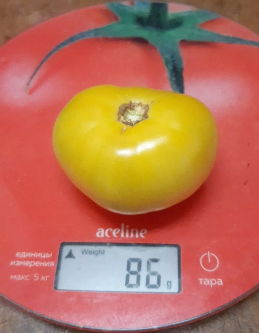 Плоды формируются кистями. Их форма классифицируется как плоскокруглая, часто с заметной, но неглубокой ребристостью в области плодоножки. В состоянии технической спелости окраска светло-зеленая, без темного пятна у основания. Полное созревание характеризуется равномерным переходом в уникальный светло-лимонно-желтый цвет, который отличает сорт от других желтоплодных томатов с более оранжевым или золотистым оттенком.