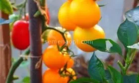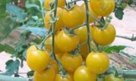 Цвет зрелых плодов — желтый, но его оттенок может варьироваться в зависимости от освещенности и условий выращивания: от нежного лимонного до теплого янтарно-золотистого. Плоды собраны в простые кисти, где одновременно формируется и созревает от 4 до 6 одинаковых по размеру помидоров. Такие нарядные грозди очень украшают теплицу в период плодоношения.