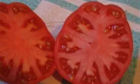 На разрезе видна мясистая, сахаристая мякоть. Плод многокамерный, содержит более шести семенных камер, но при этом количество семян в них умеренное. Такое строение обеспечивает высокие вкусовые качества: баланс сладости и характерной для томатов умеренной кислинки.