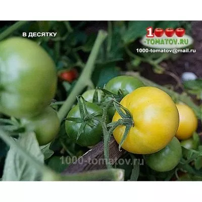 Плоды «В десятку» имеют стабильно округлую, выровненную форму, что придает посадкам опрятный, товарный вид. Их главная отличительная черта — окраска. Зрелые томаты приобретают насыщенный янтарно-желтый цвет. В технической спелости кожица обладает уникальным свойством полупрозрачности, сквозь которую могут просвечивать семенные камеры.