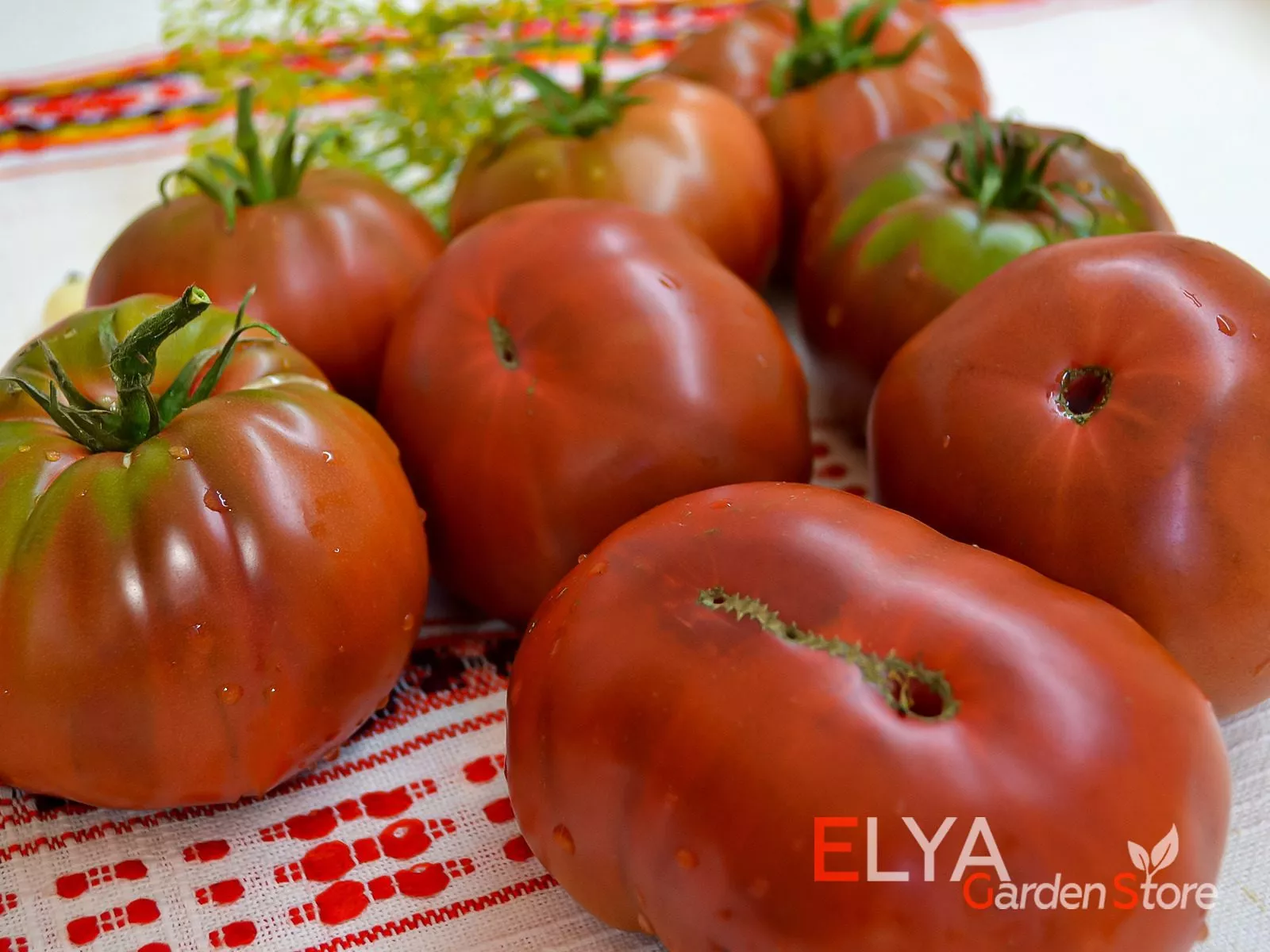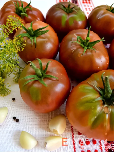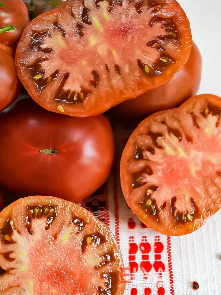 Декоративность — одно из ключевых качеств этих томатов. Глубокий, сложный цвет и глянцевый блеск кожицы делают их украшением любого блюда. На срезе также наблюдается интересная игра оттенков: мякоть может иметь насыщенный красно-коричневый цвет с более темными или бордовыми прожилками.