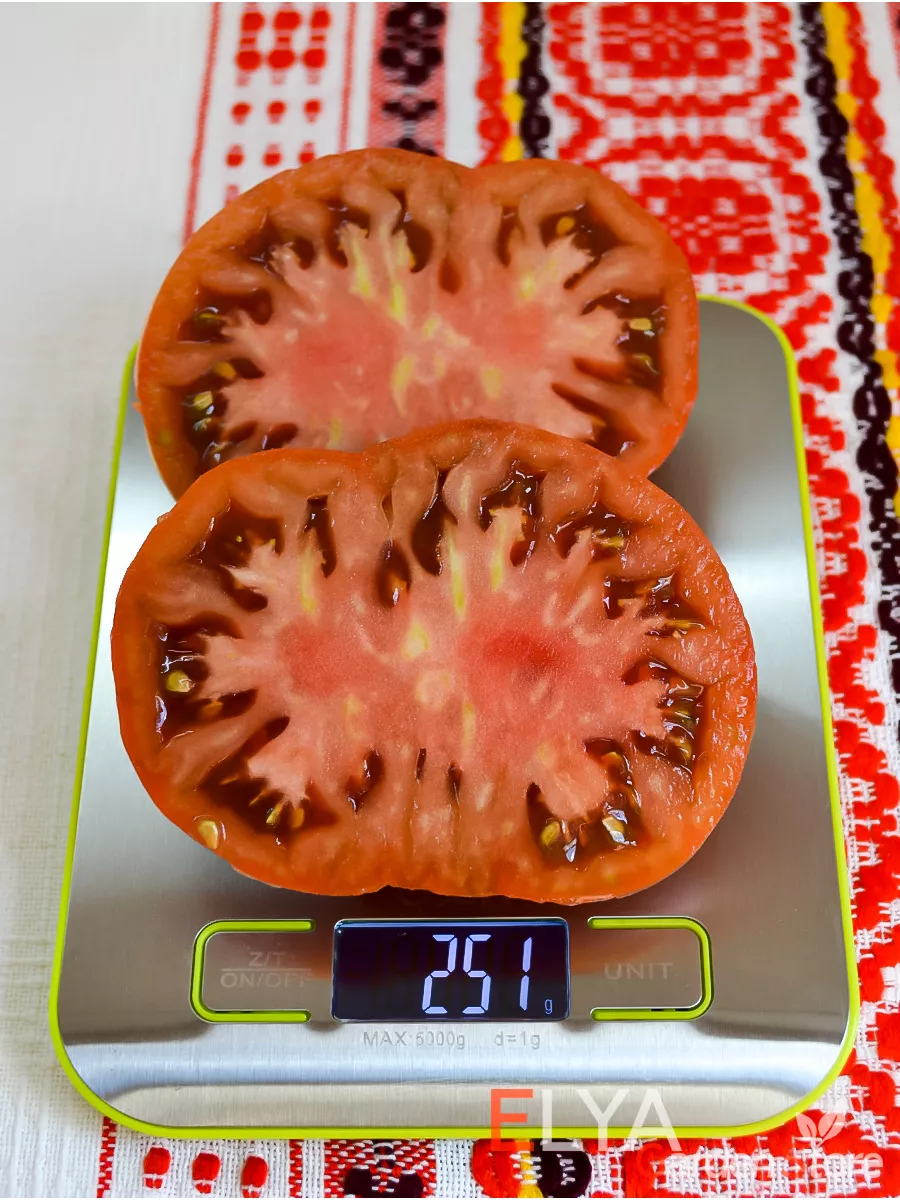 Форма соответствует заявленной плоскоокруглой, с легкой, иногда едва заметной ребристостью именно в области крепления к плодоножке. Эта особенность не портит внешний вид, а лишь добавляет плодам характерную «томатную» фактурность.