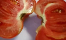 Мякоть у плодов мясистая, плотная, многокамерная, с небольшим количеством сока и семян. Такая структура, характерная для многих биф-томатов, делает их идеальными для нарезки и свежих салатов – ломтики не растекаются и сохраняют форму. Вкус действительно сладкий, с едва уловимой классической томатной кислотностью, что создает гармоничное послевкусие.
