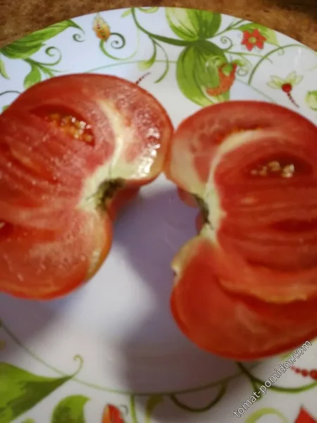 Истинная гордость сорта — его плоды. Они имеют характерную плоскоокруглую, часто слегка ребристую у плодоножки форму. В стадии полной зрелости томаты приобретают насыщенный красно-малиновый цвет. Средняя масса плода колеблется от 400 до 600 граммов, а первые, самые нижние завязи могут наливаться значительно крупнее.