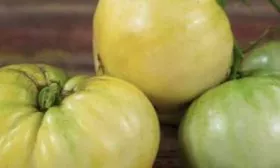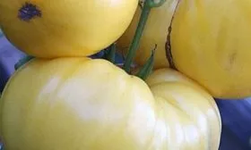 Главная отличительная черта сорта — уникальная окраска зрелых помидоров. Она двухцветная и меняется в процессе созревания. Изначально зеленые плоды с темным пятном у плодоножки постепенно наливаются, приобретая нежно-кремовый, почти фарфоровый основной тон.