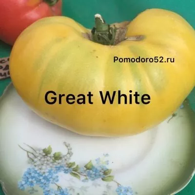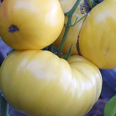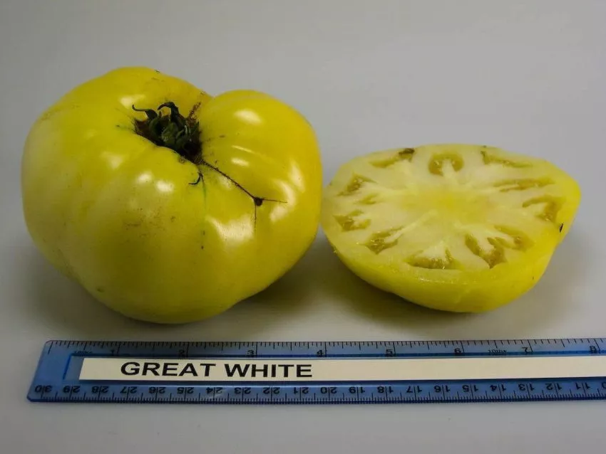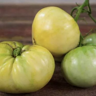 Главная отличительная черта сорта — уникальная окраска зрелых помидоров. Она двухцветная и меняется в процессе созревания. Изначально зеленые плоды с темным пятном у плодоножки постепенно наливаются, приобретая нежно-кремовый, почти фарфоровый основной тон.