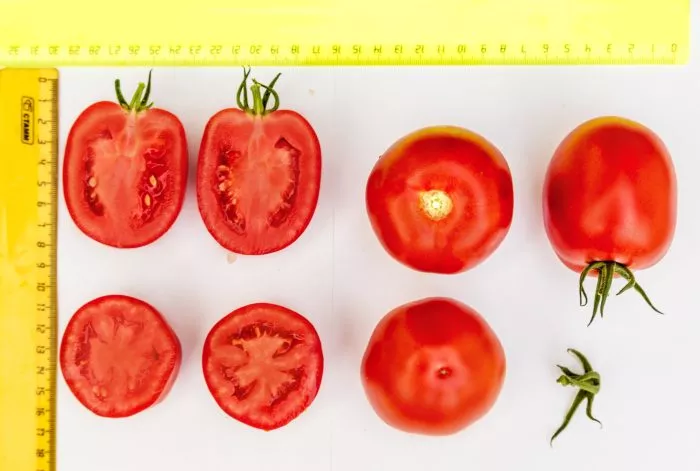 Кубовидная форма плодов, заявленная в характеристиках, проявляется стабильно. Ребристость выражена умеренно, чаще всего в верхней части, не делая помидор угловатым. В процессе созревания окраска меняется равномерно: от насыщенного зеленого в технической спелости до однородного красного цвета без зеленого пятна у плодоножки при полном созревании.