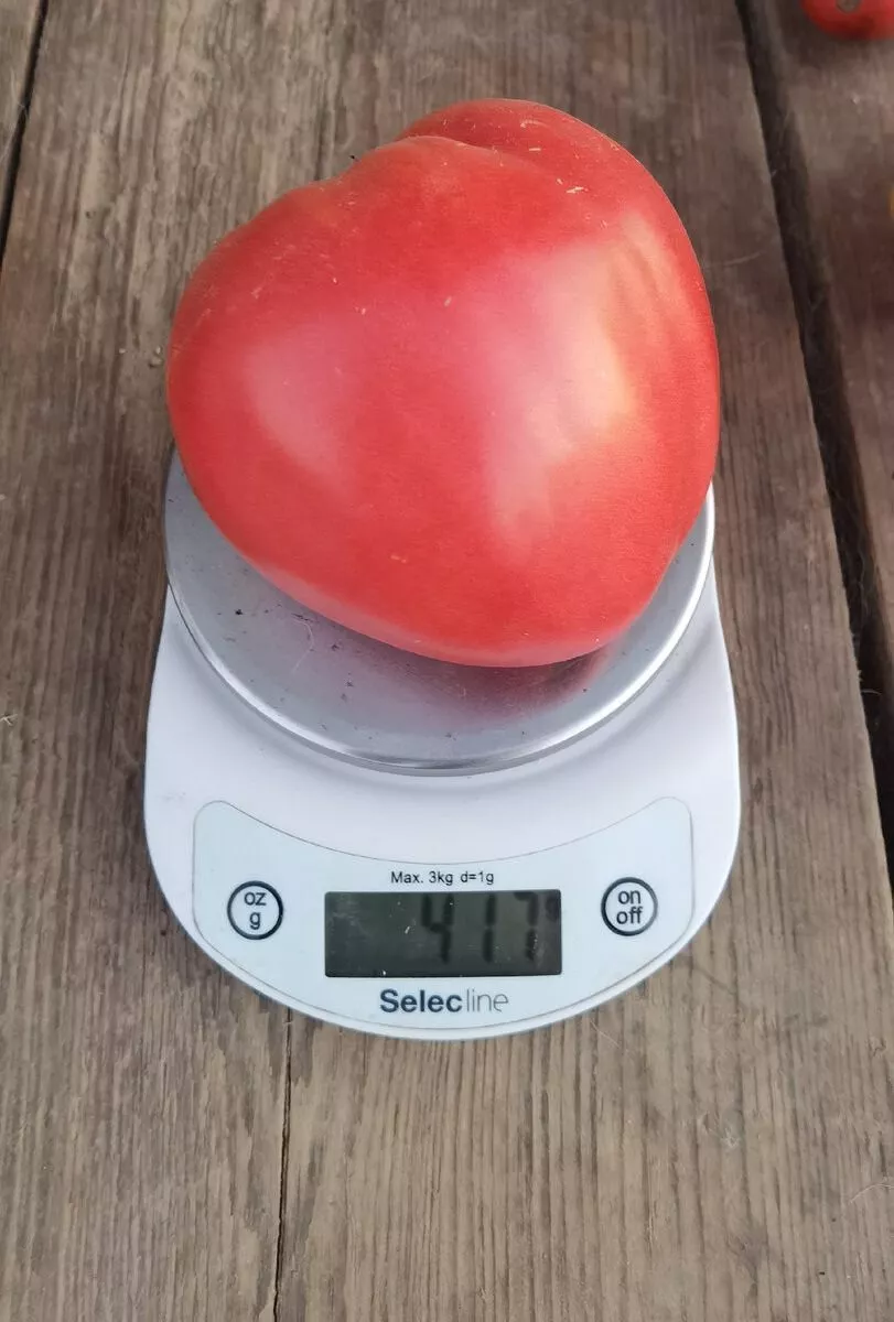 Плоды имеют ярко выраженную сердцевидную форму, часто с характерным заостренным кончиком («носиком»). Их окраска в стадии полной биологической спелости описывается как насыщенный малиново-розовый или розовый цвет. Важная деталь: у полностью созревшего томата у плодоножки отсутствует зеленое пятно, что говорит о равномерном созревании и высоком качестве.