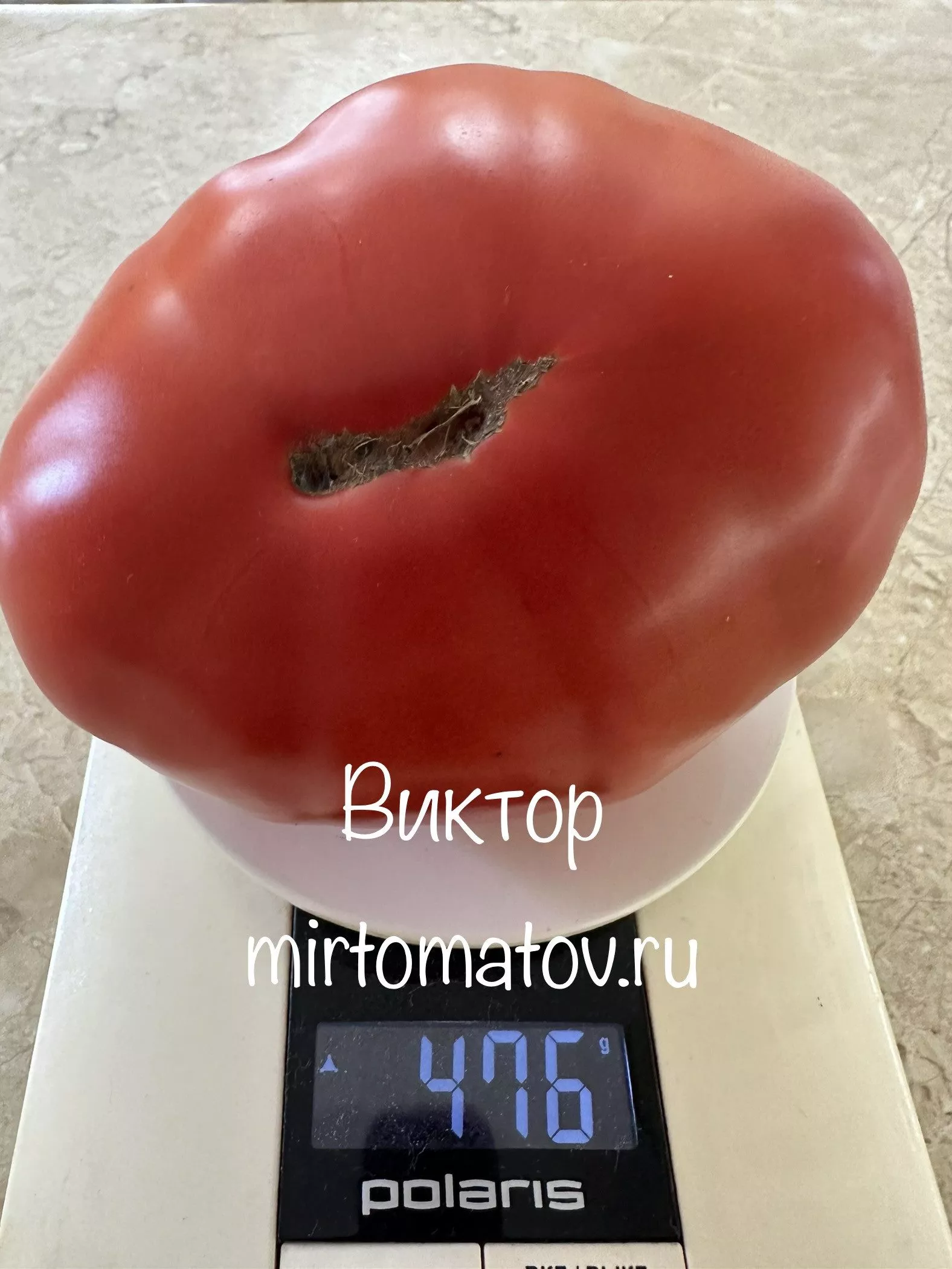 Плоды — визитная карточка этого сорта. Их главные отличительные черты — размер, форма и мясистость. Плоды плоскоокруглые, с выраженной ребристостью у плодоножки, особенно у самых крупных экземпляров первого яруса.