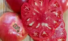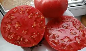 На разрезе видна многокамерная, очень мясистая и сахаристая мякоть того же темно-малинового цвета. Семенные камеры занимают небольшой объем, основная часть плода — это плотная, нежная мякоть с высоким содержанием сухих веществ. Вкус соответствует заявленному «деликатесному» профилю: насыщенный, сладкий, со сложным фруктовым послевкусием и едва уловимой пикантной кислинкой, которая балансирует сладость.
