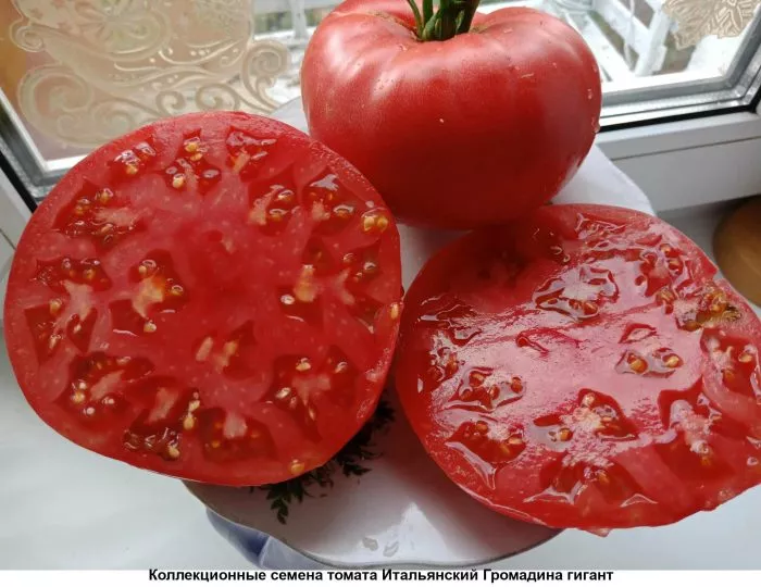 На разрезе видна многокамерная, очень мясистая и сахаристая мякоть того же темно-малинового цвета. Семенные камеры занимают небольшой объем, основная часть плода — это плотная, нежная мякоть с высоким содержанием сухих веществ. Вкус соответствует заявленному «деликатесному» профилю: насыщенный, сладкий, со сложным фруктовым послевкусием и едва уловимой пикантной кислинкой, которая балансирует сладость.