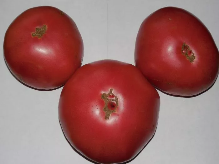 Форма плодов плоскоокруглая, нередко с заметной ребристостью в области плодоножки. Эта ребристость особенно выражена у самых крупных томатов, придавая им характерный «бочкообразный» вид.