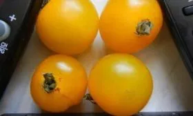 Каждый плод — идеально округлый, как бусина, ярко-желтого цвета без каких-либо пятен или полос. Масса 15-20 грамм делает их эталонными черри. Кожица плотная, но не грубая, что предотвращает растрескивание и делает плоды пригодными для цельноплодного консервирования.