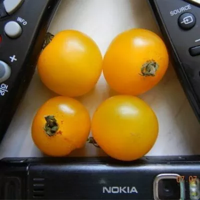 Каждый плод — идеально округлый, как бусина, ярко-желтого цвета без каких-либо пятен или полос. Масса 15-20 грамм делает их эталонными черри. Кожица плотная, но не грубая, что предотвращает растрескивание и делает плоды пригодными для цельноплодного консервирования.