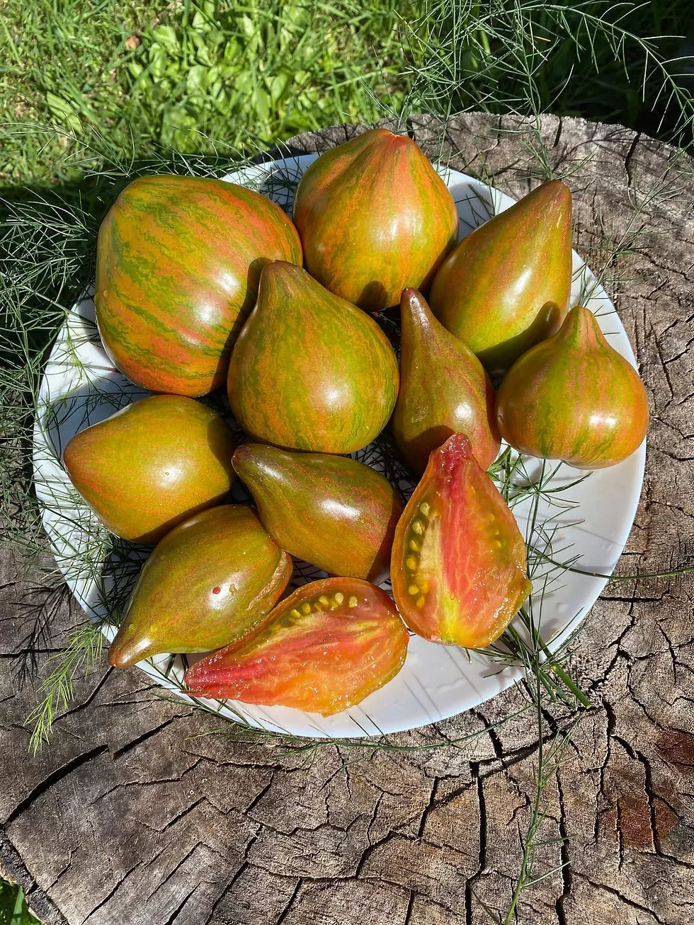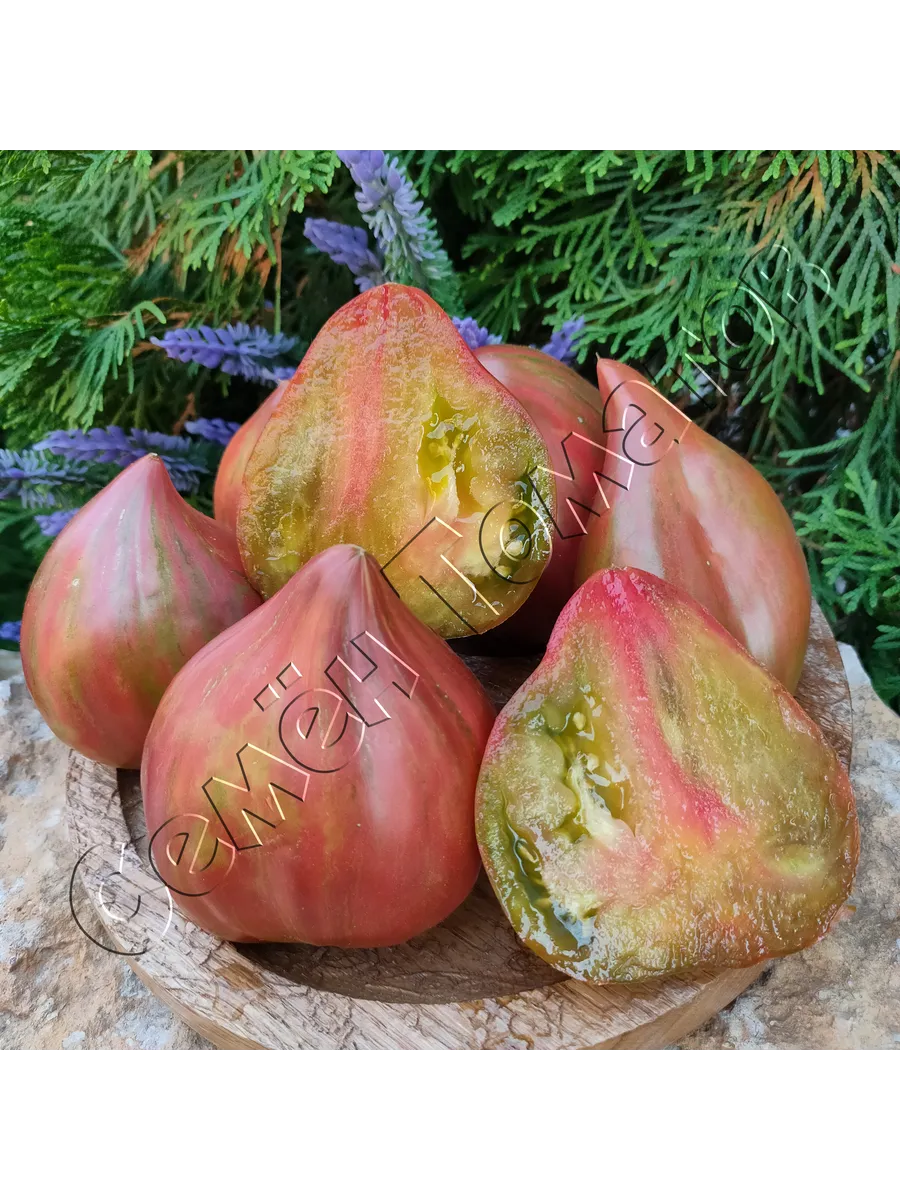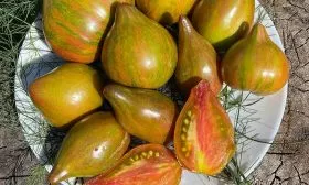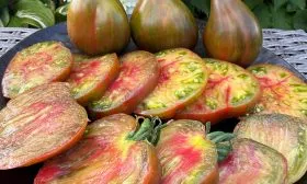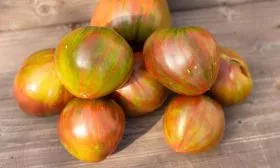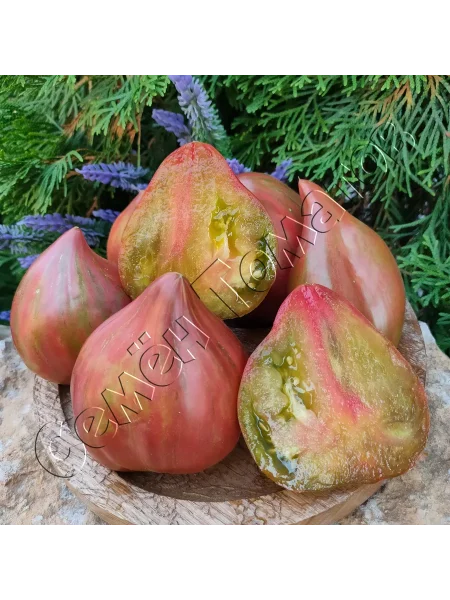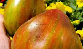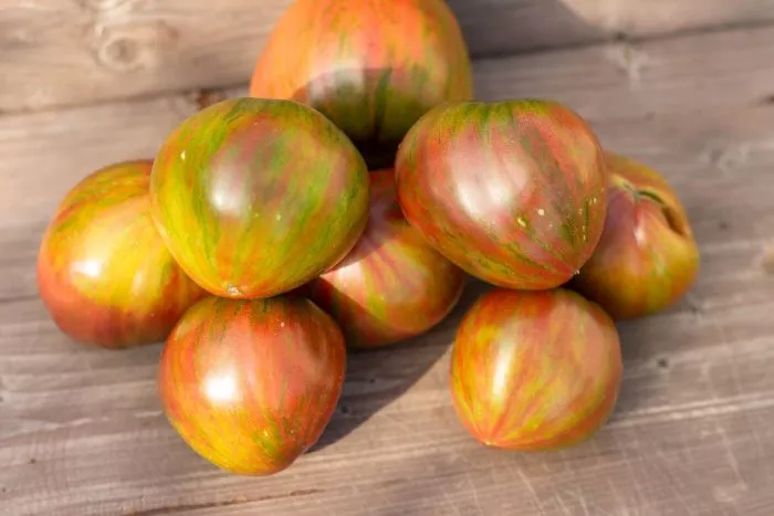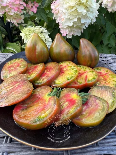 Окрас — это визитная карточка сорта, делающая каждый собранный помидор уникальным. Незрелый плод имеет зеленую окраску с темным пятном у плодоножки. По мере созревания начинают проявляться полосы, разводы и крап различных оттенков: бронзового, оранжевого и красного.