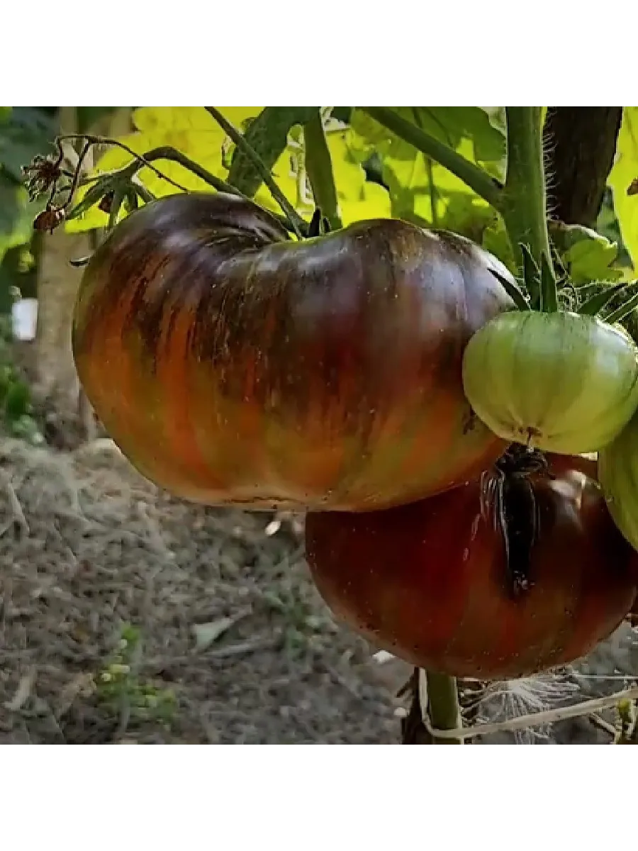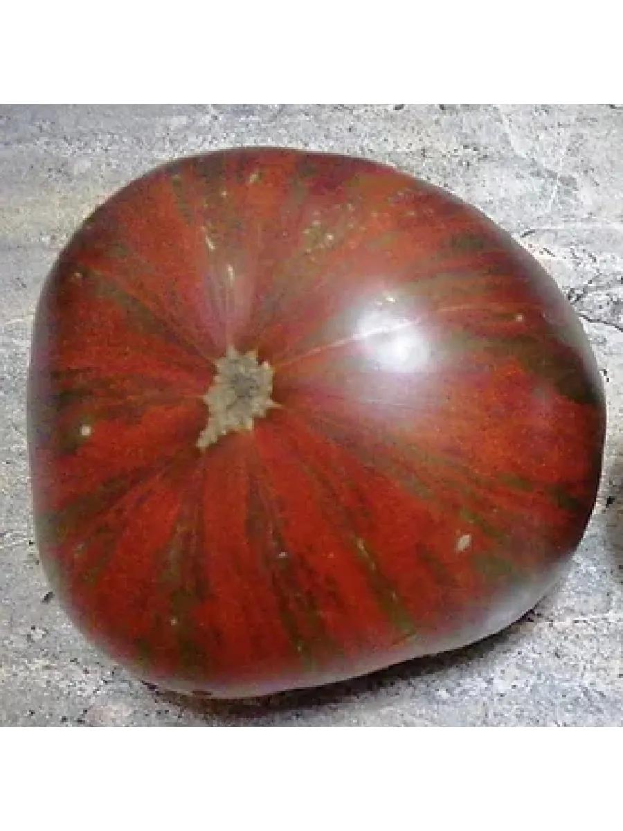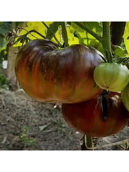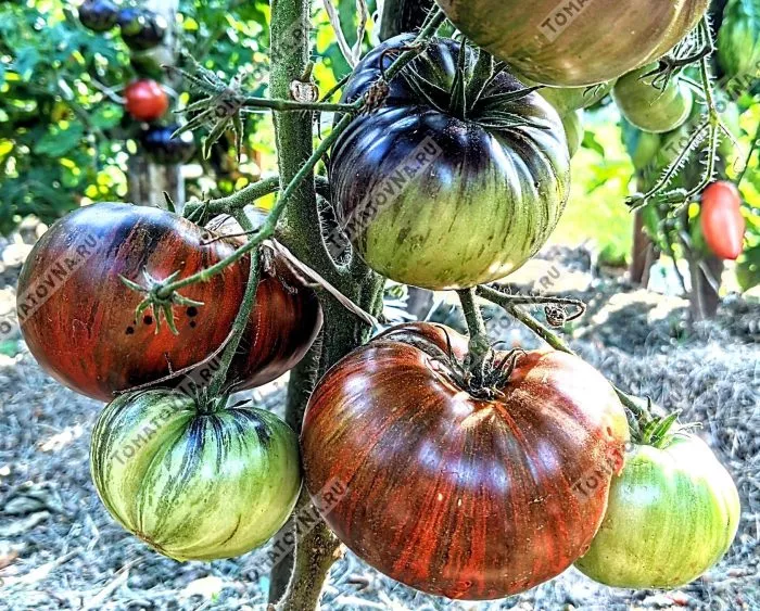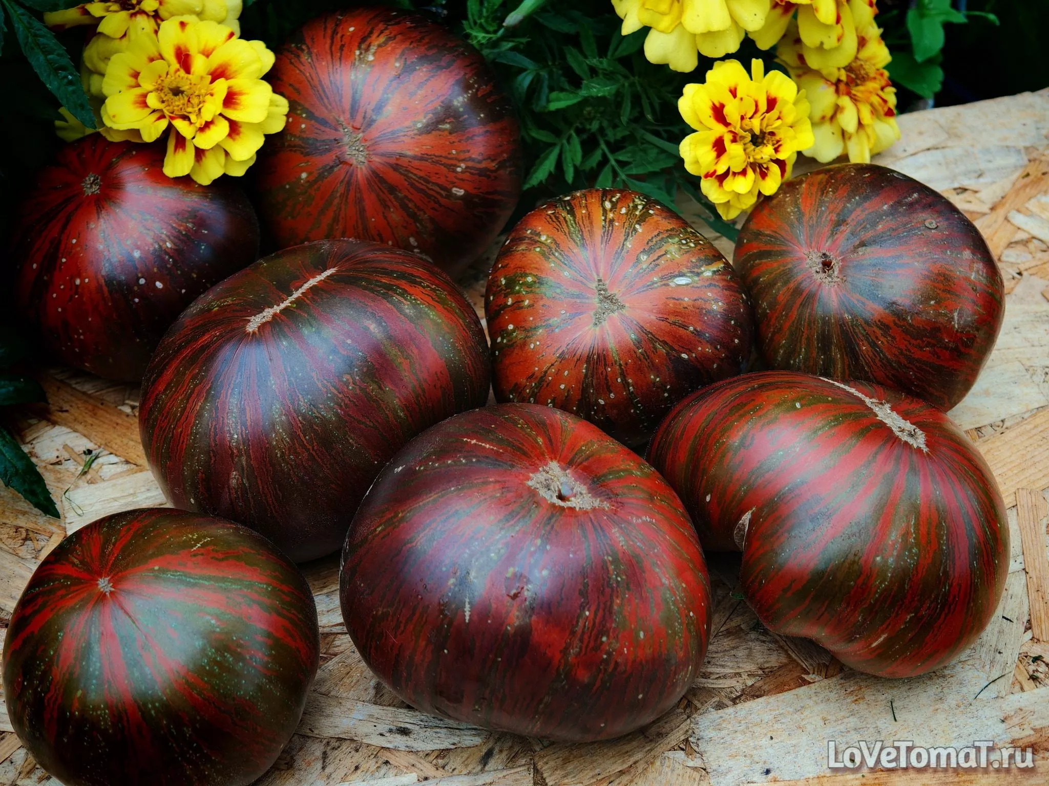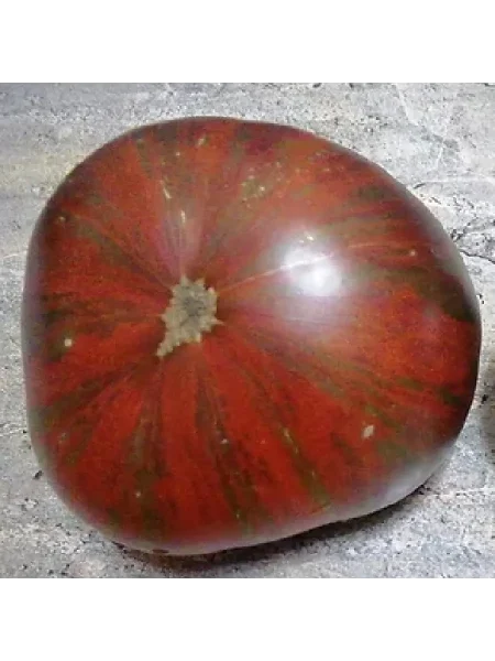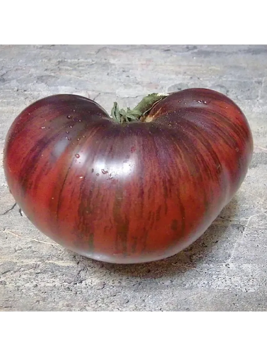Окраска — главный отличительный признак. Зрелый плод имеет сложный многоцветный окрас: основной фон пурпурный с антоциановым (фиолетовым) напылением, а от основания расходятся контрастные зеленые и фиолетовые лучи-полосы. Эта игра цвета делает каждый томат уникальным.
