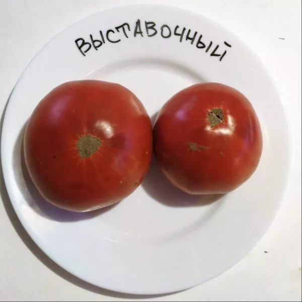 Плоды &mdquo;Выставочного» — его главная отличительная черта. Преобладает округлая, иногда слегка приплюснутая форма, часто с заметной ребристостью в области плодоножки. Часть плодов, особенно на нижних кистях, развивается в широко-сердцевидную форму. В состоянии биологической зрелости они приобретают равномерный насыщенно-красный окрас.