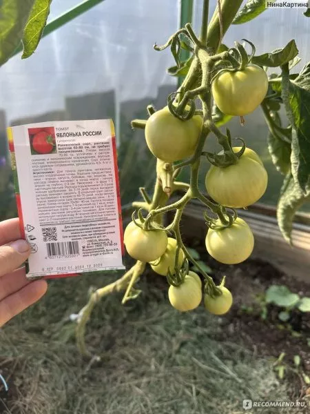 Плоды завязываются в простых и промежуточных кистях, обычно по 5-7 штук в каждой. Их форма является одной из ключевых особенностей сорта — она идеально круглая, гладкая, без выраженной ребристости. Такой внешний вид, напоминающий яблоко, и дал название сорту.