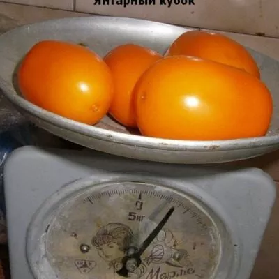 Плоды «Янтарного кубка» — его главная отличительная черта. Их форма далека от классической круглой и определяется как цилиндрическая с четко выраженным заостренным носиком. Такая конфигурация делает томаты визуально похожими на небольшие кубки или перцы.