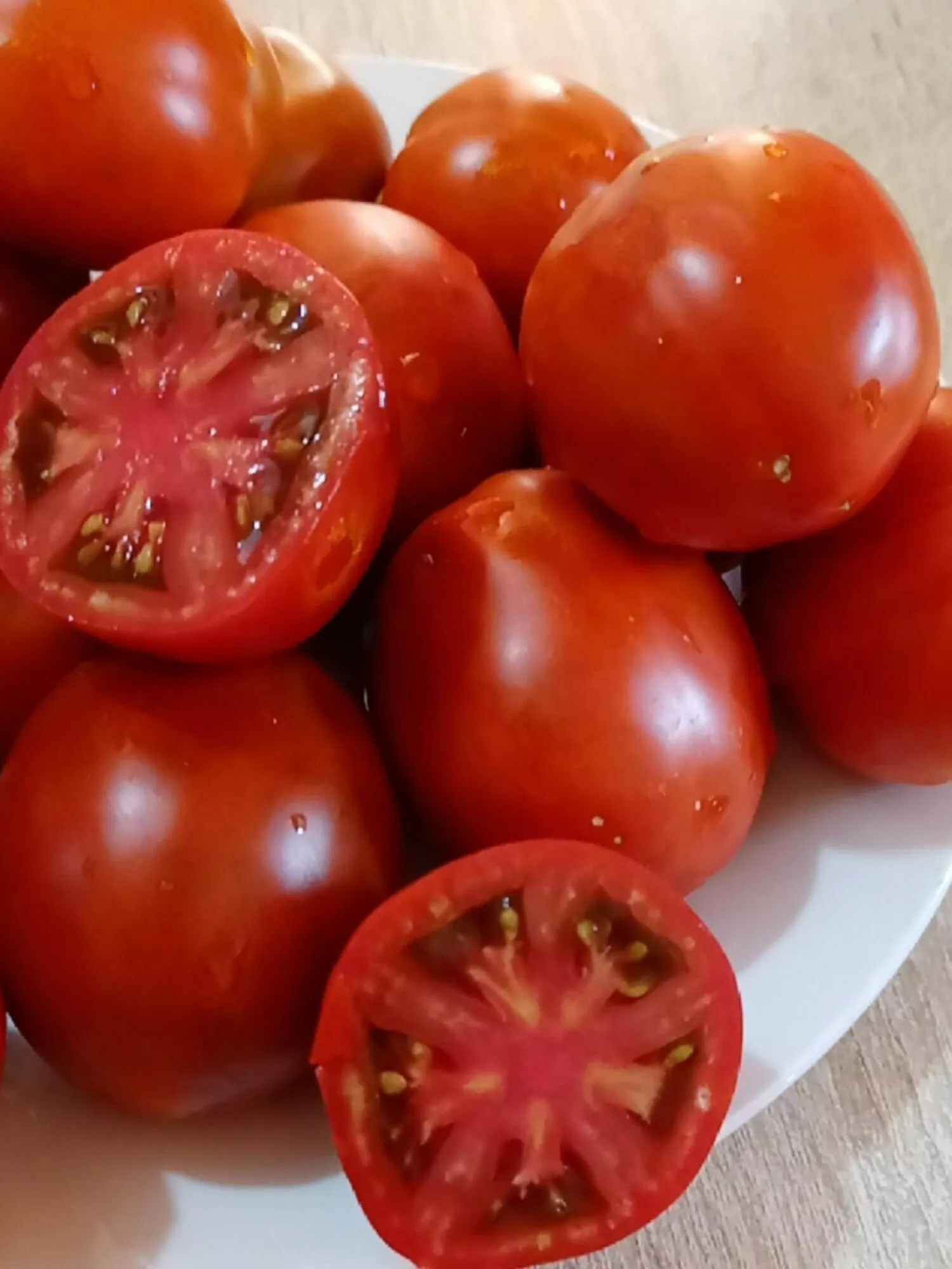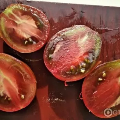 Мякоть при полном созревании плотная, мясистая, с малым количеством семян и малыми семенными камерами. Ее цвет — насыщенный красный, иногда с рубиновым отливом, что создает красивый контраст с более темной кожицей. Плоды имеют среднюю массу 100-150 граммов, что в сочетании с плотной структурой делает их идеальными для цельноплодного консервирования.