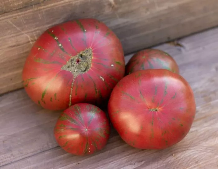Вторая определяющая особенность — уникальная окраска плодов. Сочетание вишнёво-розового основного фона с контрастными тёмно-зелёными полосками делает плоды этого сорта легко узнаваемыми. Эта расцветка не только декоративна, но и является маркером сортовой принадлежности. Полоски наиболее ярко выражены в период технической спелости и могут немного меняться в интенсивности в зависимости от уровня освещенности.