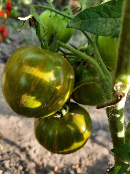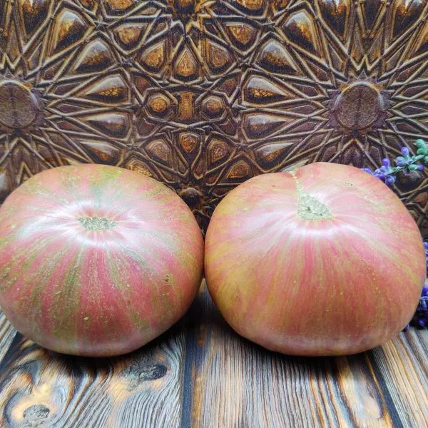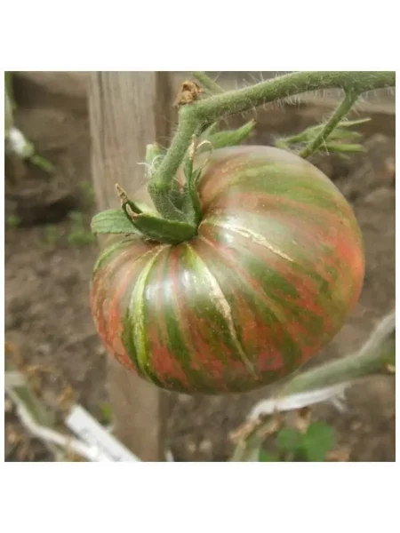 Эта «тигровая» расцветка не исчезает при полном созревании, что делает плоды исключительно декоративными. Форма плоскоокруглая, может наблюдаться слабая ребристость в области прикрепления к плодоножке. Широкий диапазон массы плодов (150-350 г) указывает на сильную зависимость их размера от условий выращивания, уровня агротехники и нагрузки на куст.