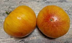 Плоды — ключевая отличительная черта сорта. Их пастельно-оранжевый, солнечный цвет обусловлен высоким содержанием каротиноидов и сразу выделяет урожай среди других томатов. Форма варьируется от ровной округлой до приплюснутой плоскоокруглой, часто с легкой ребристостью у плодоножки.