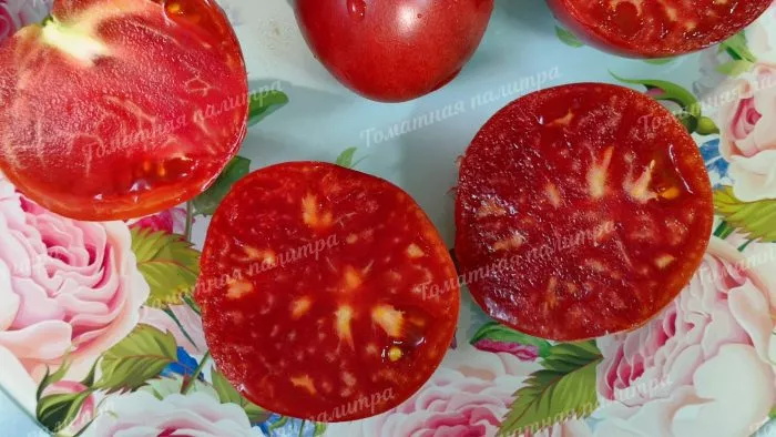 На срезе плод многокамерный (более 6 камер), с выраженной мясистостью, так называемого «биф-типа». Семенные камеры небольшие, заполнены желеобразной массой с незначительным количеством семян. Стенки плода (перикарпий) толстые и плотные, что положительно сказывается на сохранности и транспортабельности урожая.